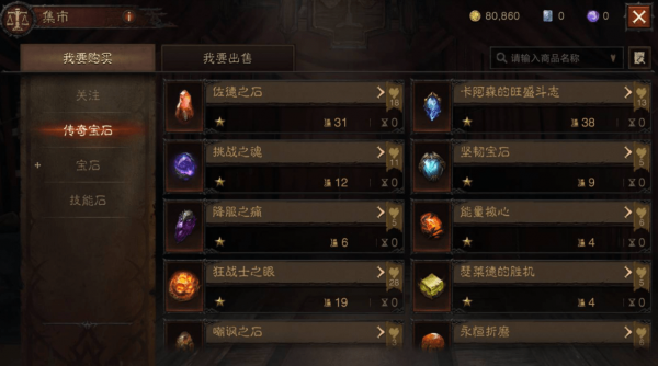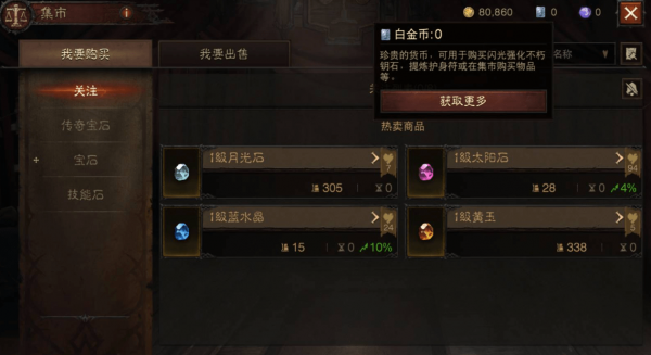 市场上所有交易都使用白金币,购买普通宝石、传奇宝石、技能石都需要白金币。