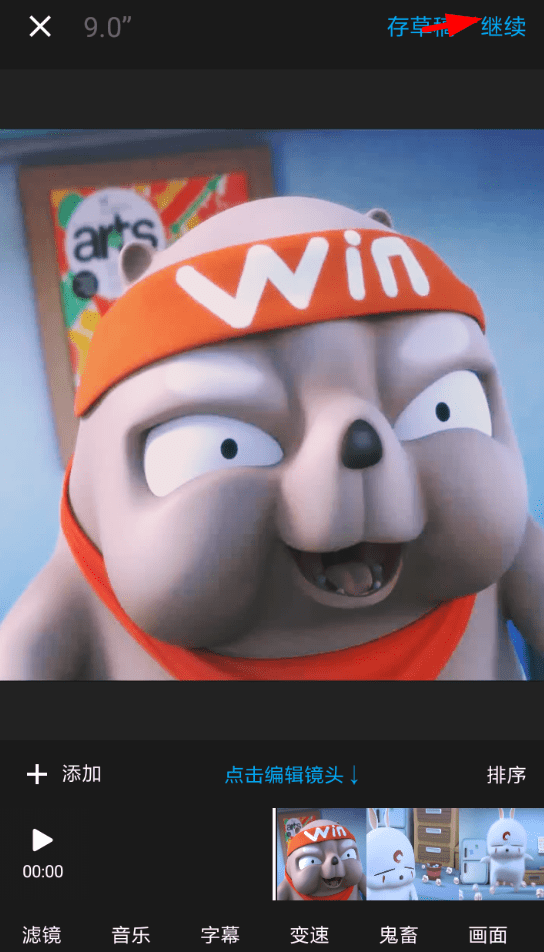 2、成功编辑视频并添加各种特效、字幕、音乐后,可以通过右上角的“继续”选项进入视频发布界面。