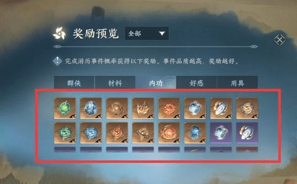 完成旅行时间有可能获得黄金内功技能。建议把所有的食物和所有的旅行道具都放在包里!