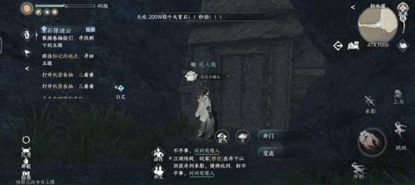 前往指定坐标,进入洞穴。遇到封闭的石门,可以和里面的人对话,选择可以对话的位置拿到钥匙,然后开门进入,完成后续对话得到河边的鱼,打败怪物打开宝箱。