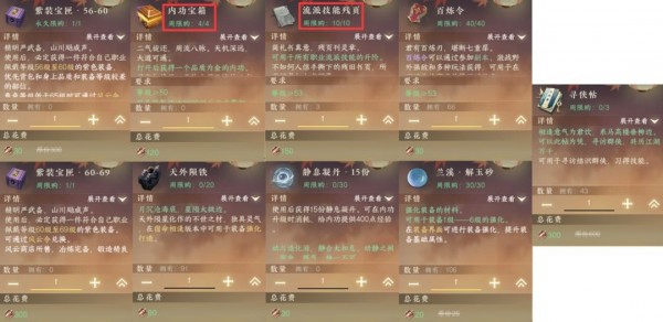 以内功百宝箱为主,其余宁丹、活力丹,其余换兰溪婕妤砂!