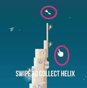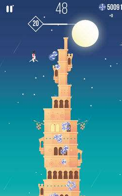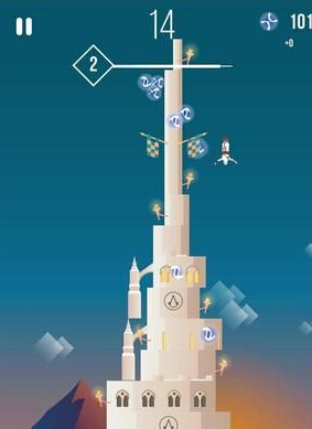 7.在刺客下降的过程中,你可以用手控制他曲线下降的方向,尽可能让他碰到蓝光点。这是游戏“金币”,可以用来买道具。另外,如果你准确的降落在塔底的草堆上,还可以获得金币奖励。