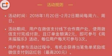2.活动期间,用户在微信支付线下合作商户使用微信支付完成支付,订单金额满2元即可参加周末摇滚音乐活动,每个用户每天只能参加三次!