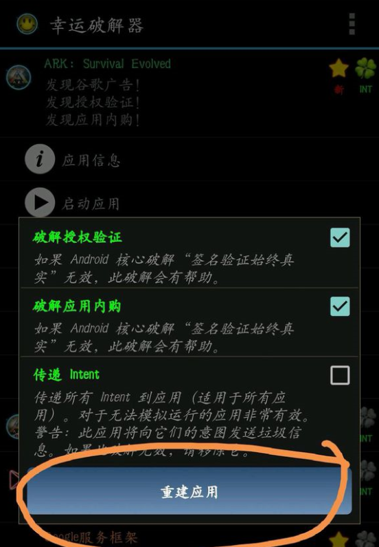 2、点击“破解菜单”功能,使用“破解内购”选项进行破解,不过在此之前,记得更改obb文件夹中方舟游戏文件夹的名称。