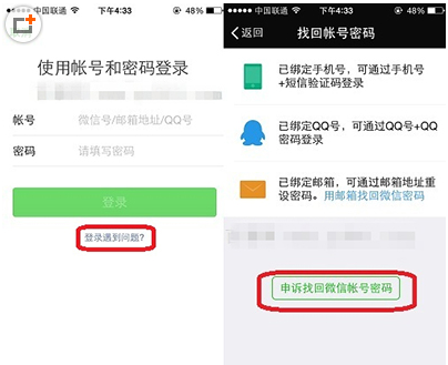 2.如果你注册微信的手机已经被停用,尝试以下方法,点击上图中的“其他方式登录”,输入微信/邮箱/QQ号,填写密码登录,如图;如果忘记密码,没有绑定QQ号,那么点击“登录有问题”,然后“投诉找微信找好密码”,如下图所示: