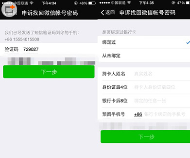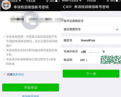 3.选择“开始投诉”,然后“我记得微信号”,输入相关信息和当前使用的手机号,点击“下一步”,如下图所示: