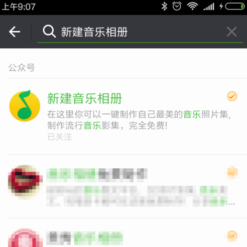 1.进入微信,点击添加好友,在微信官方账号搜索“新音乐专辑”,关注,进入微信官方账号。