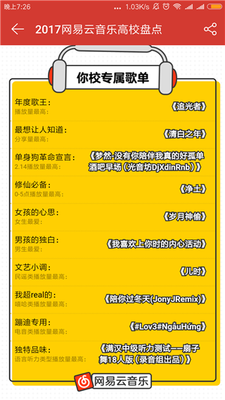 网易云音乐日前发布了2017年高校盘点,这是各大高校听歌的数据榜单。您是否也想了解您学校的音乐数据列表?下面小编就给大家带来:网易云2017大学生音乐排行榜查看地址分享