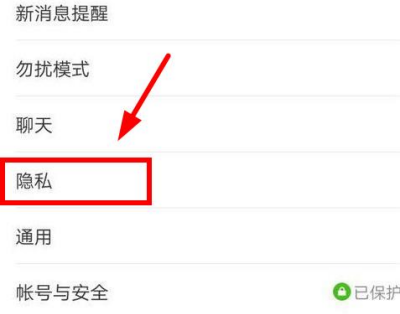 2.然后在设置页面,可以看到新的消息提醒、勿扰模式、隐私、通用、账号和安全等功能选项。选择“隐私”选项进入隐私主页。