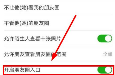 4.然后在下面的朋友圈设置中,找到“打开朋友圈”后的关闭按钮。关闭后,“发现”里的朋友圈会被隐藏,你发的朋友圈不会是空的,好友还是可以看到的。