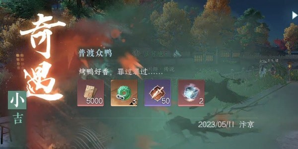 3.对话结束后,我们的冒险任务普渡鸭子就完成了,我们会得到娇子、铁元、内功石;