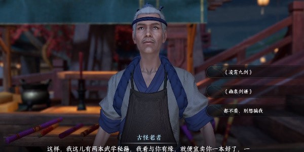 4.选完后,继续和那个古怪的老头聊。他会给我们凌霄的九把剑,他可以跳过对话来完成任务。
