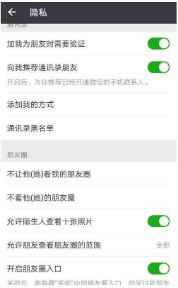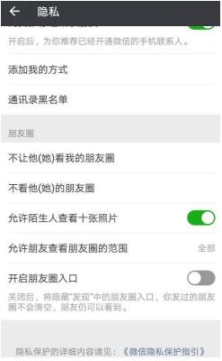 4、然后在下面的朋友圈设置中找到“打开朋友圈入口”后面的按钮并关闭。关闭后,“发现”中的朋友圈条目将被隐藏。您发布的朋友圈不会被清除,您的好友仍然可见。