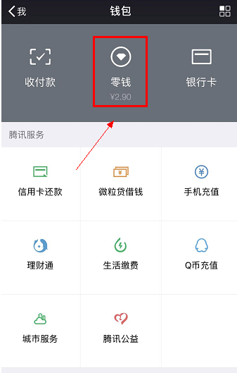 3.进入钱包后,点击上方的零钱按钮,如下图所示。