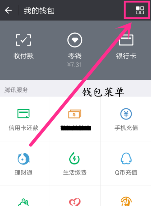 2.然后在我的钱包页面,点击右上角的“钱包菜单”进入支付中心,如图。