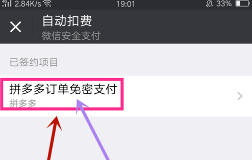 5.在自动扣费中,可以勾选自己微信支付合同的扣费项目,点击进入“拼多多订单免密支付”项目,如图。