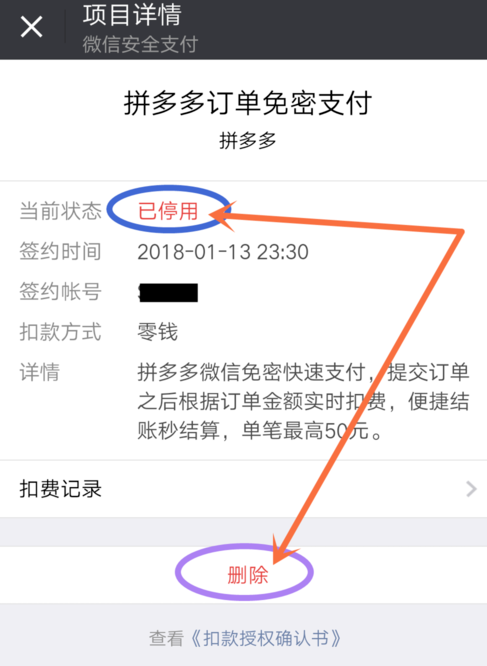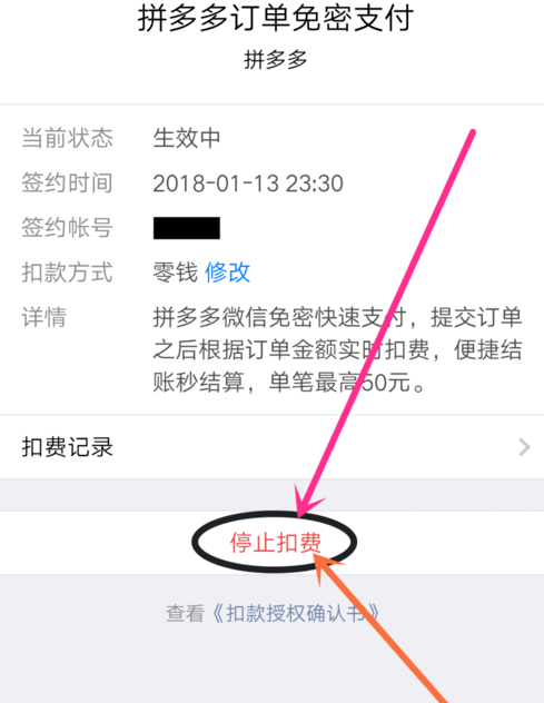 6.在项目详情中,点击“停止扣款”取消该项目的免密支付,如图。