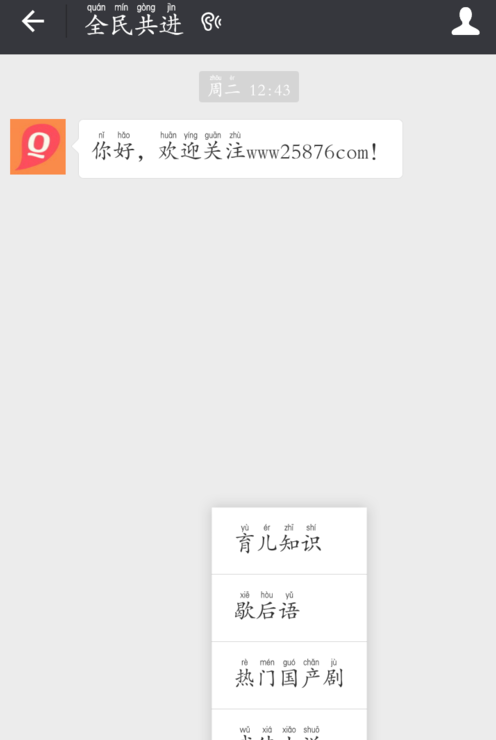 2.找到“全民共进”微信官方账号,点击关注;