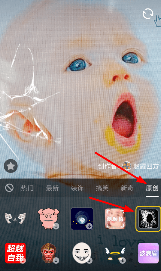成功打开特效列表后,选择“原创”类别,即可找到碎屏特效并进行设置(如下图)。这时,如果镜头前的人物张开嘴,就能呈现出碎屏的效果。