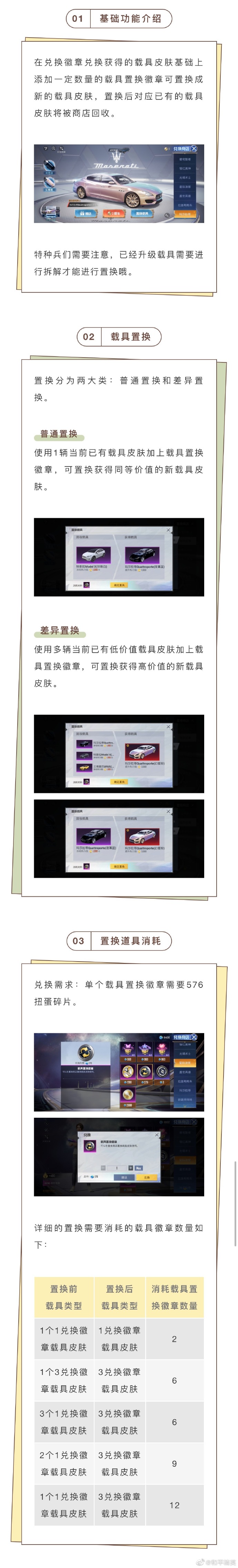 2.差别替换:利用多个现有的低值车辆皮肤和车辆替换徽章,可以替换一个新的高值车辆皮肤。