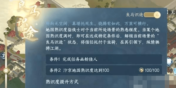 2.汴京地图熟悉度100%,可以触发好马找路任务。只需按导航即可完成。