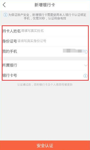 3、在添加银行卡页面,输入持卡人姓名、身份证号码、手机号码、所属银行、银行卡号进行安全认证和绑定;