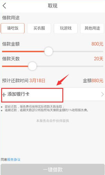 4、返回提现界面,选择贷款用途、贷款金额、贷款天数,然后点击一键提现;