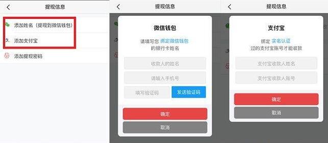 2.您可以提现至微信钱包或支付宝。只需点击即可绑定微信钱包和支付宝信息。另外,点击添加,添加反射密码,如图: