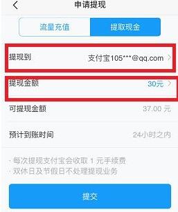 4、最后点击第一个红色框选择提款到微信或者支付宝,在第二个框选择提现金额,然后点击提交,如图: