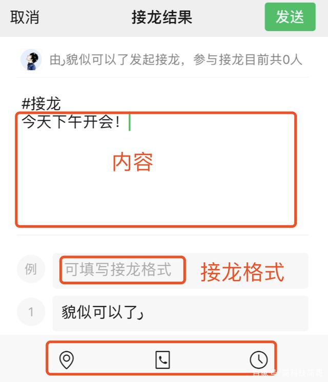 点击进入后,我们可以在里面输入要发布的内容,也可以在下面填写接龙的格式。另外,在底部,我们可以选择地点、通讯录、时间三项中的一项,完成后可以直接发送。