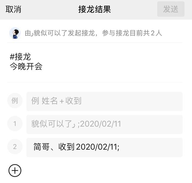 群友收到后,点击“查看接龙”进入,然后点击里面的加号,输入相关内容。