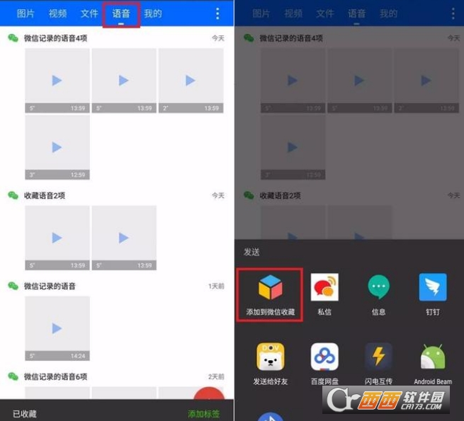 打开“微迹”APP后,可以搜索本地的微信记录,比如图片、视频、文件、语音等等。点击【语音】,选择要转发的语音。长安之后,点击右下角【发送】,选择【添加到微信收藏】。