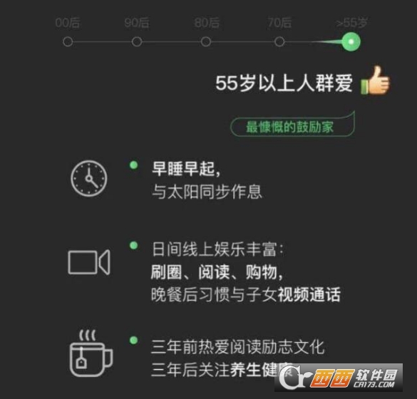 55岁以上的人最喜欢的表达是“喜欢”。他们早睡早起。平时网上娱乐很丰富,有刷,有看书,有购物。晚饭后,他们习惯和孩子一起看视频。三年前,他们热爱阅读励志文化,但现在他们关心的是保持健康。