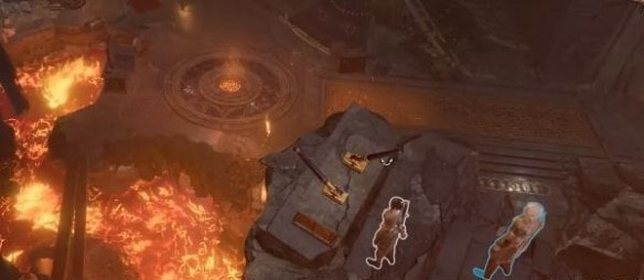 到了台阶的位置,你会发现你要走到对面去了。你可以选择一个角色站在机制板上,操作杠杆把它送到对面。