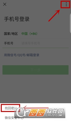 在微信登录界面的窗口,点击屏幕右上角竖立的三个点,屏幕下方会弹出两个选项。选择找回密码和微信安全中心,进入找回密码界面。