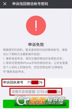 最重要的一步出来了,上诉结果会提示失败。页面上有投诉回执号码。拿纸笔记住回执号,拨打申请回执号下方的客服热线。