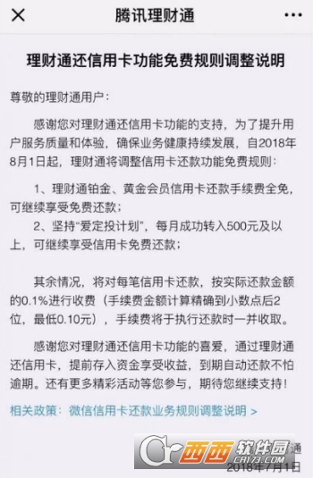 2018年8月1日起,仅理财通白金、黄金会员继续享受信用卡还款免手续费政策,通过“爱定投计划”转入500元及以上的用户可继续享受免费还款服务。此外,所有理财通用户每次信用卡还款将被收取0.1%的费用,最低为10美分。