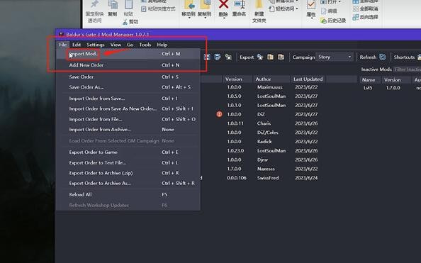 2.打开新下载的mod管理器,然后点击左上角的文件,选择导入mod添加MOD。