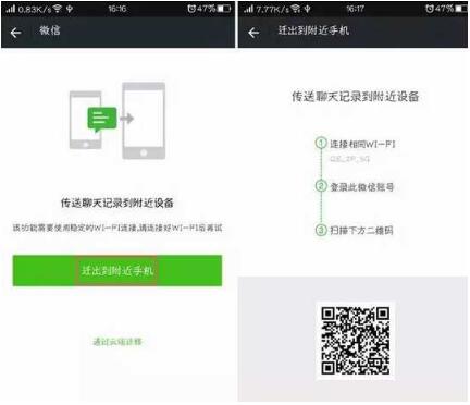 进入【微信】-【我的】-【设置】-【聊天】-【聊天记录备份与恢复】-【移至附近的手机】,按照界面显示的步骤备份聊天记录。