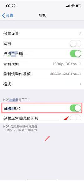 2)最后点击下方【自动HDR】旁边的开关,开启相机的HDR功能。 (如下所示)