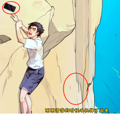 2.他身后是一座很高的悬崖。男人的手紧紧抓着土,土却有点松。