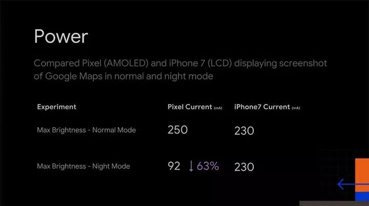 续航能力的提升与手机的屏幕材质有关。以Google的测试数据为例。它使用LCD屏幕的iPhone 7和OLED屏幕的Pixel手机进行比较。当两者在启用深色模式后使用地图导航时,Pixel 手机的功耗下降了63%,而iPhone 7 则没有太大变化。