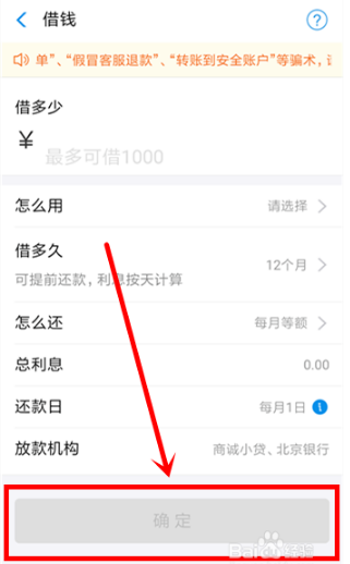 3、在如下【借款】界面,填写所需信息后,点击【确定】即可按照流程完成借款