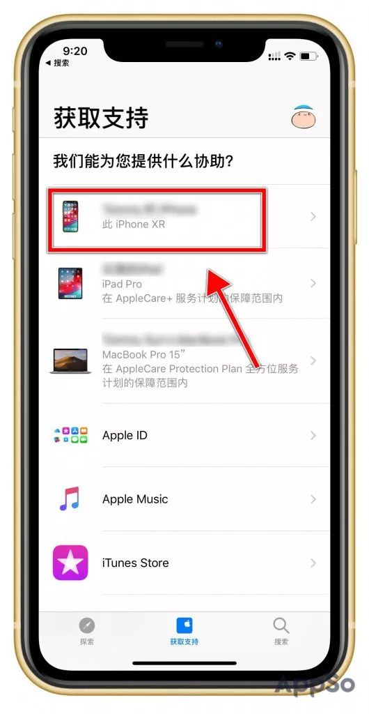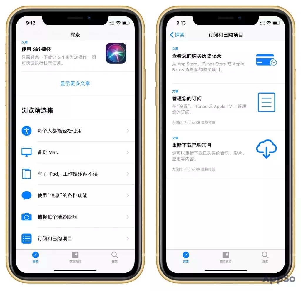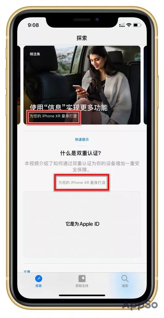 当您首次使用“Apple 支持”时,该应用会默认与当前设备的iCloud 帐户关联,并自动识别该帐户绑定的设备类型。根据不同的设备类型,系统会为每个用户推荐相应的内容。比如我使用的是iPhone XR,我在第一屏看到的内容更多是关于iPhone XR的使用技巧。