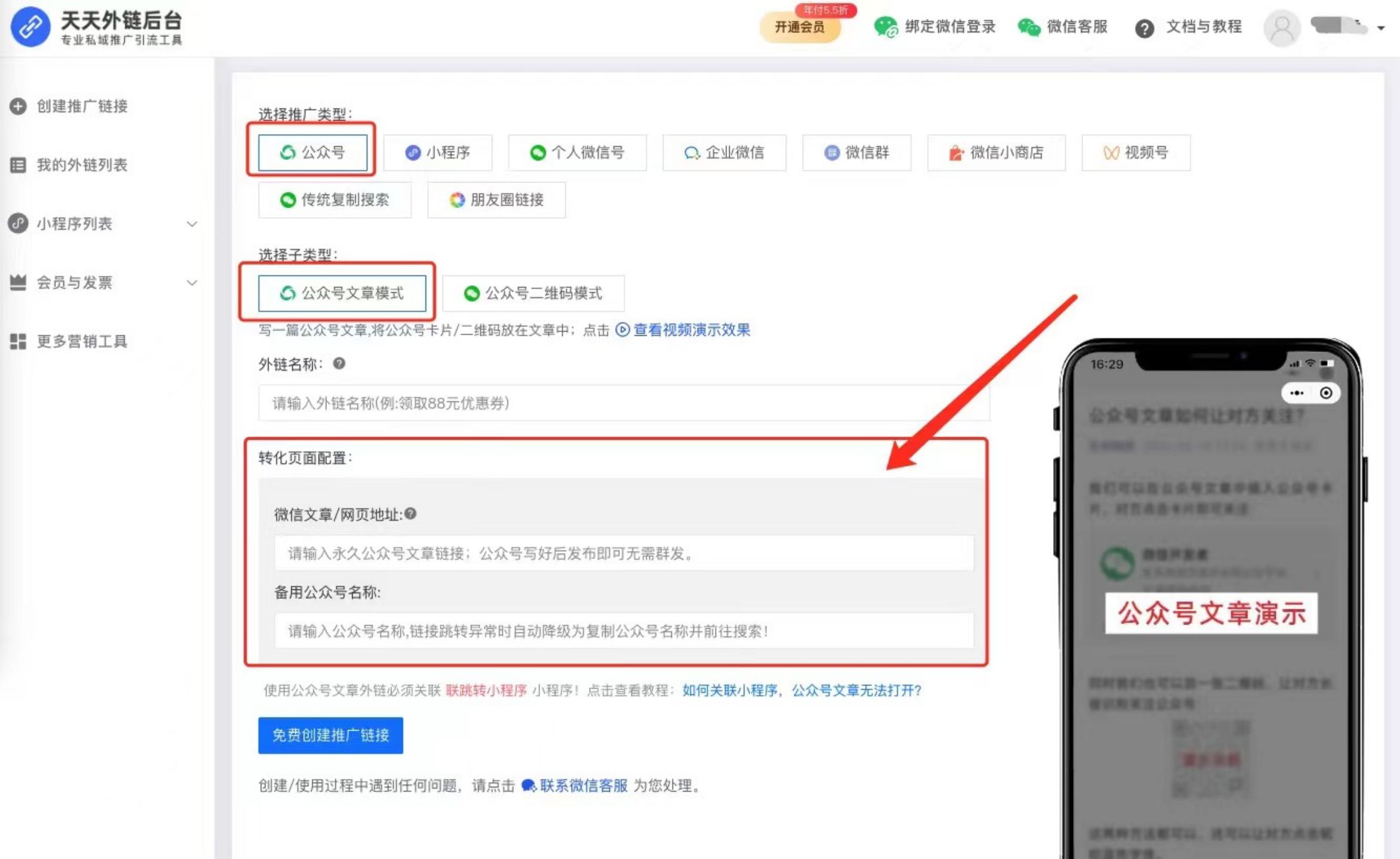 第三步:点击选择微信官方账号,填写外部链接名称,注意微信官方账号相关参数的准确性(不知道微信群相关参数的可以登录我们官网查看)。如果不知道怎么填,可以先看演示。