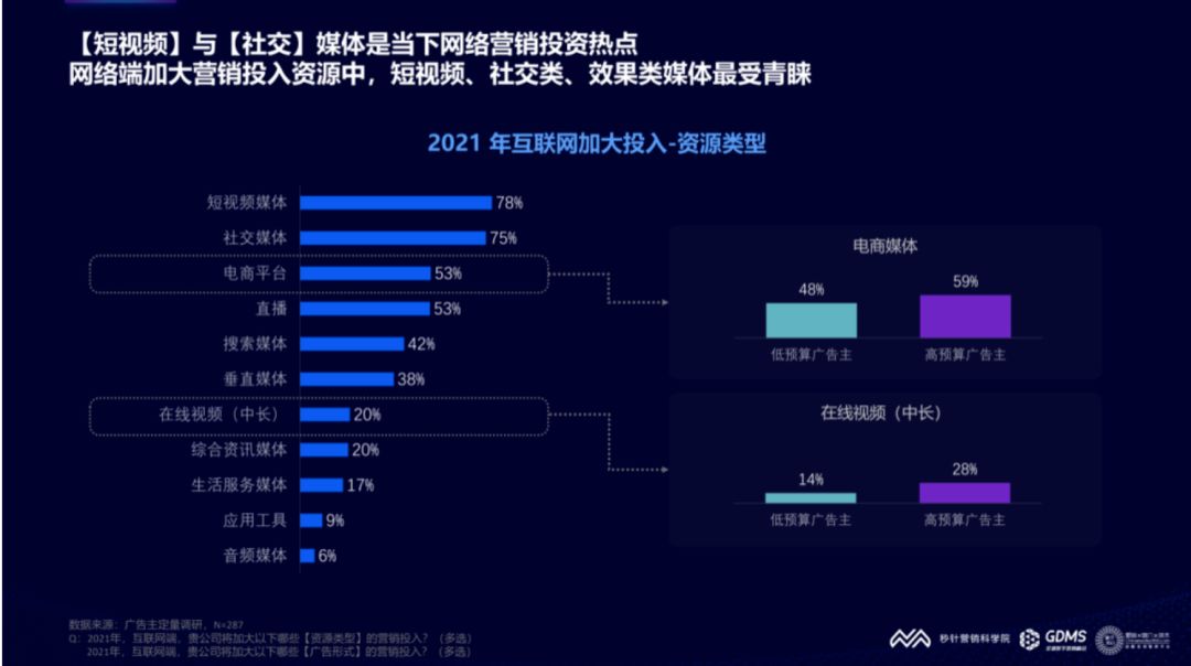 根据《2021年中国数字营销趋势报告》,在线营销资源中,短视频、社交媒体和效果媒体最受欢迎,增加短视频和社交媒体的广告主比例高达78%和75%。