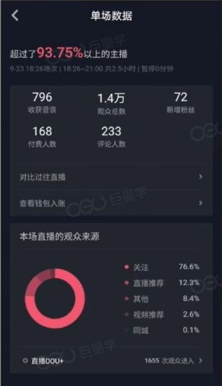 直播到直播间的推荐流量/今日播放量:364/119391=0.42%