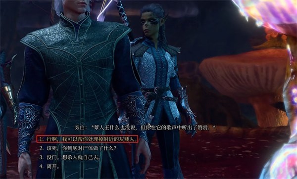 3.通过与蘑菇王的对话,我们可以知道他们的氏族和矮人目前都面临着灰矮星的屠杀。如果我们选择帮助他们,我们将获得法术奖励,并前往蘑菇之王的宝库。