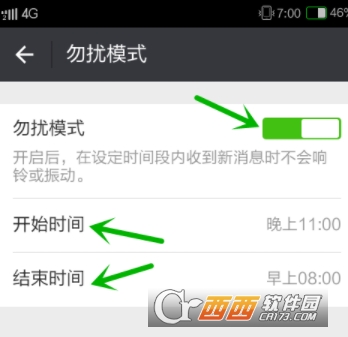 6.请勿打扰模式灯条变为绿色后,您可以单击开始时间和结束时间进行设置。