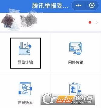 找到“腾讯举报受理中心”界面,显示六类举报,分别是:网络诈骗、网络传销、信息贩卖、黄赌毒、民事侵权及其他有害等。这里我们选择“网络诈骗”,点击进入;
